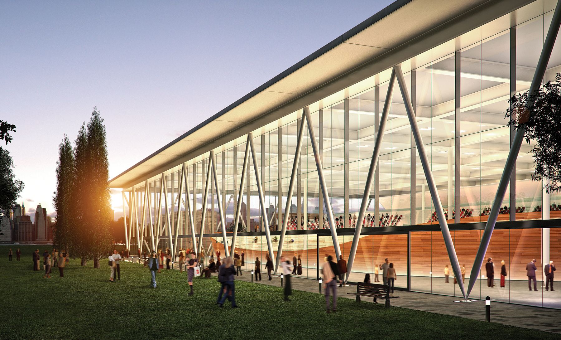VoNYC Inc. — a privately funded nonprofit promoting track cycling in New York City — commissioned a design concept and feasibility study for this 3,000-seat, 110,000-square-foot multiuse building, which combines athletic facilities with retail space, a café, community center, exhibition galleries, public art, offices, locker rooms and pre-function areas. Designed for a variety of cycling competitions, the Velodrome’s 200-meter track surrounds a 22,000-square-foot infield that can be used for other sports, concerts, film screenings and conferences. A continuous glass curtain wall surrounds the track and seating areas, defining the space and allowing the public to look in and sports-spectators to gaze out. The wooden track and its structure sit like sculpture within this glass box, while a green roof with solar panels tops the building, designed to achieve LEED Gold certification.