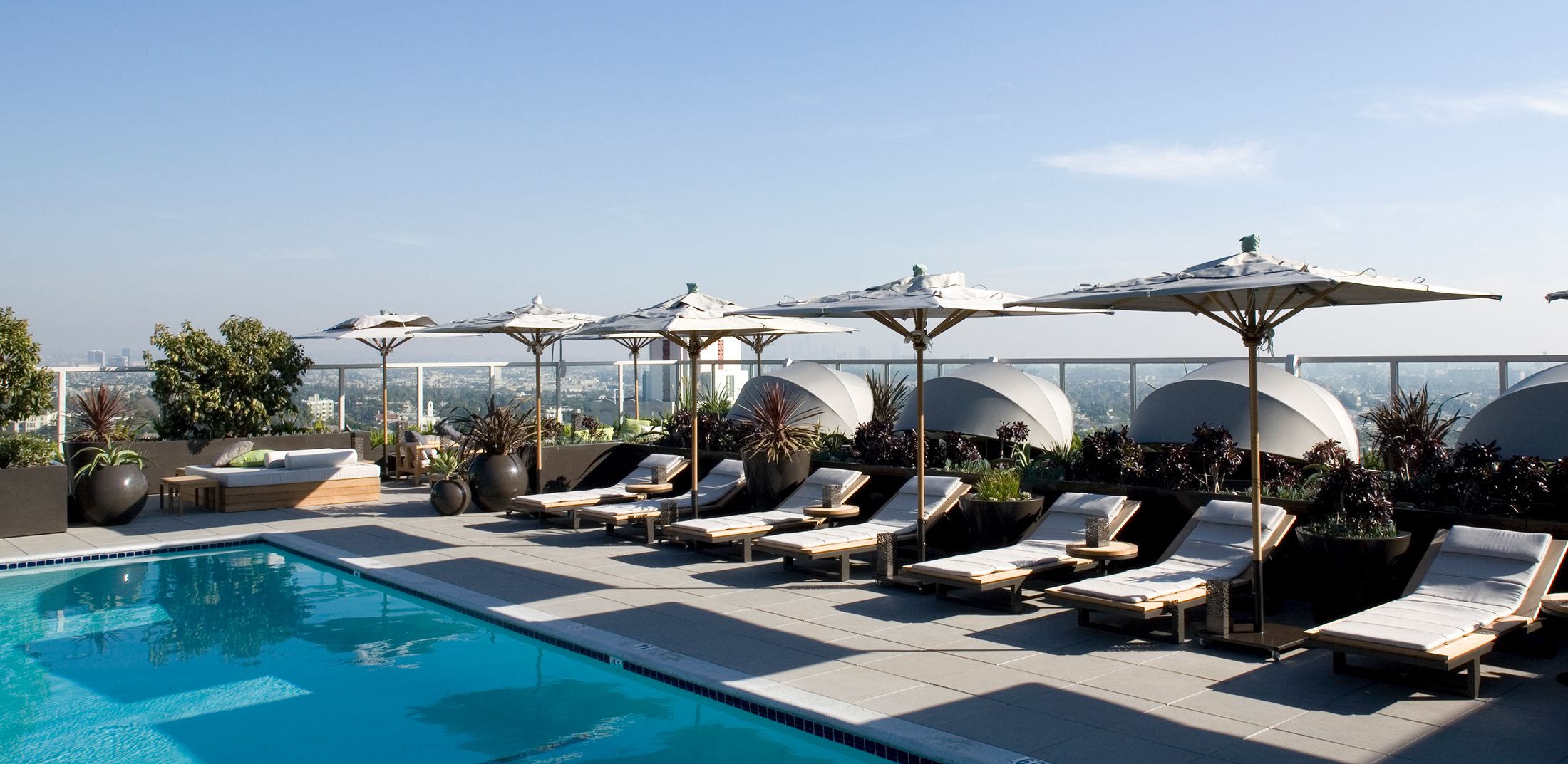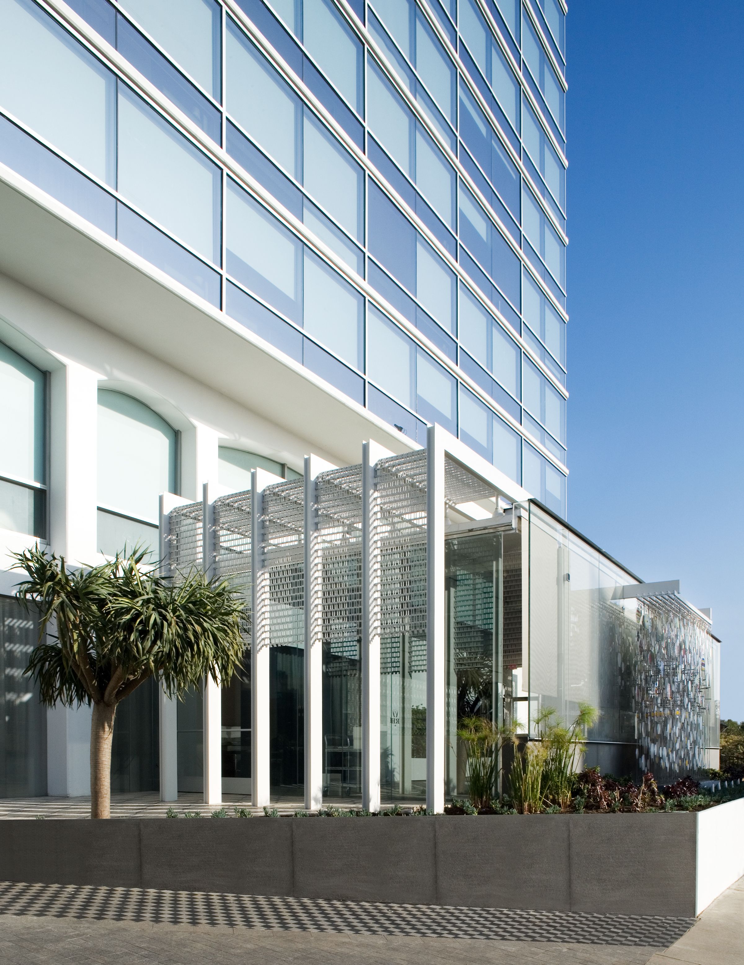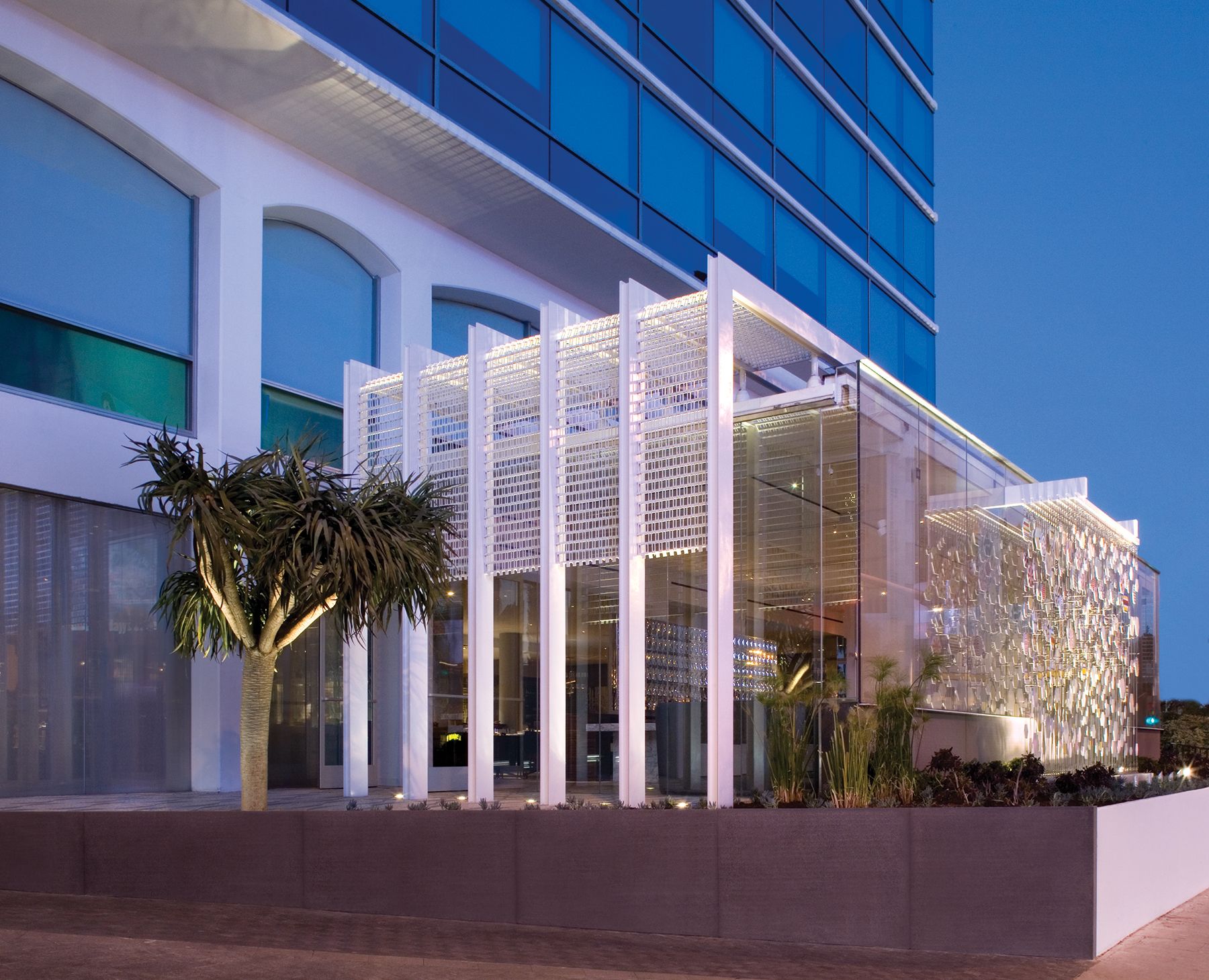 Begun in 2004 as a renovation of Los Angeles’s Continental Hyatt House (once a Sunset Strip hangout for rock-and-roll royalty), this project became the American debut of Hyatt’s Andaz concept, and an entirely new scheme — conceived as an icon for an emerging brand — replaced the original notion. Inspired by the mid-century aesthetic of the 1960s property, the ultimate design pays homage to such masterful L.A. modernists as Richard Neutra and Pierre Koenig. It encloses the balconies of the west-facing rooms in glass to reinvent the building’s Sunset Boulevard façade, expanding those rooms into mini-suites with impressive views. A new steel-and-glass pavilion at the base of the hotel’s tower, with a site-specific installation by artist Jacob Hashimoto, houses the hotel’s restaurant and simultaneously serves as a new marker for the property on Sunset.