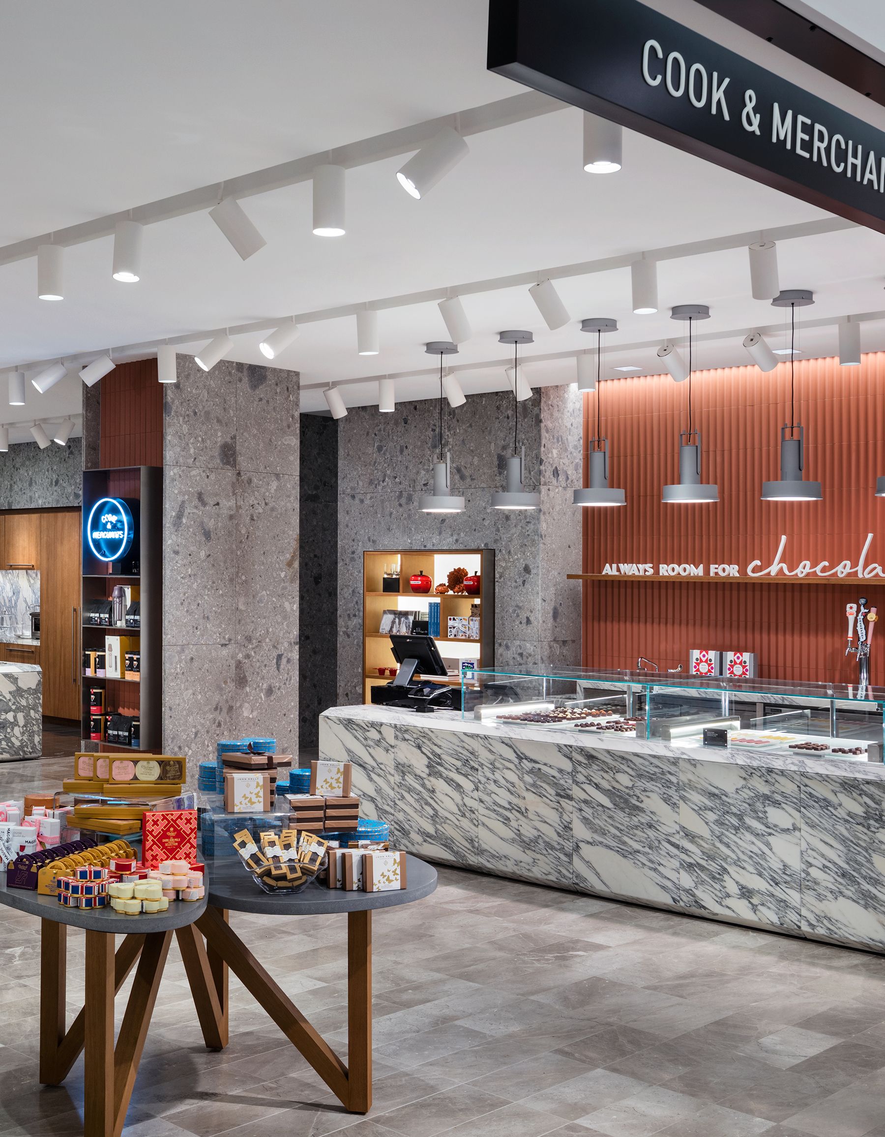 Cook & Merchants is a new Food Hall concept created by janson scuro for Neiman Marcus. The 3000 square foot space at the Hudson Yards New York City flagship includes a gourmet coffee bar, a chocolate, beer and wine bar, a spacious demonstration kitchen, and seating and retail areas.