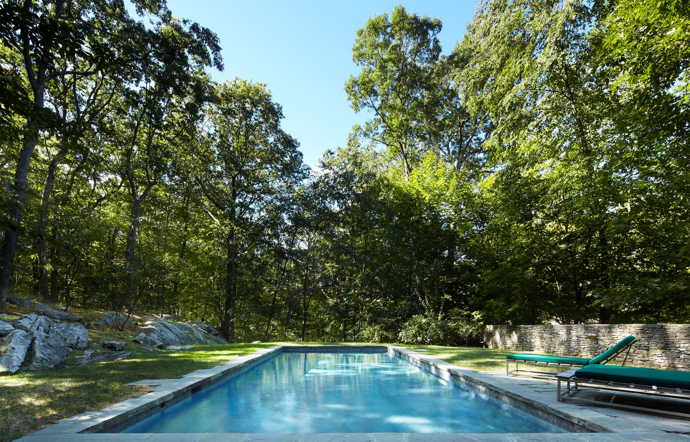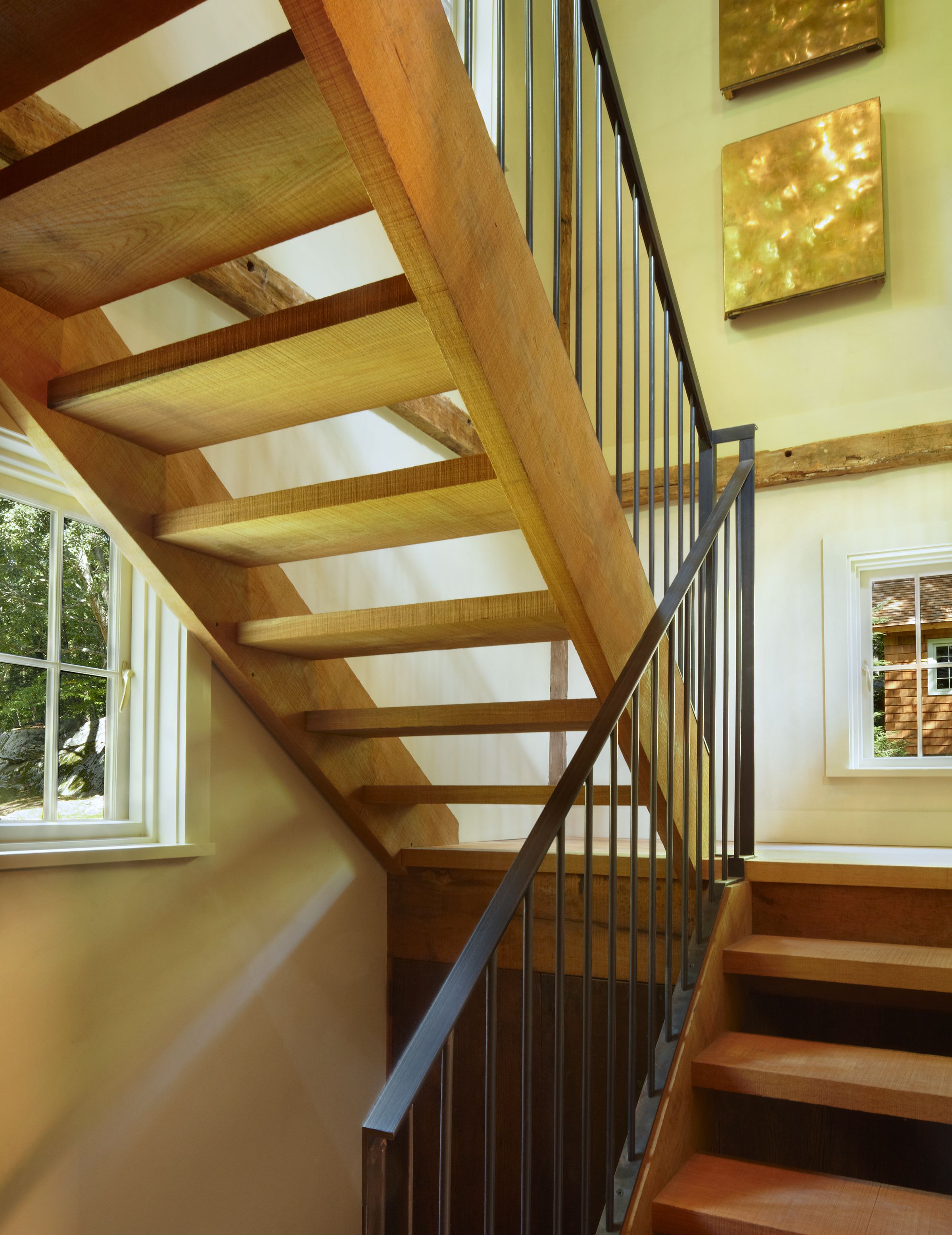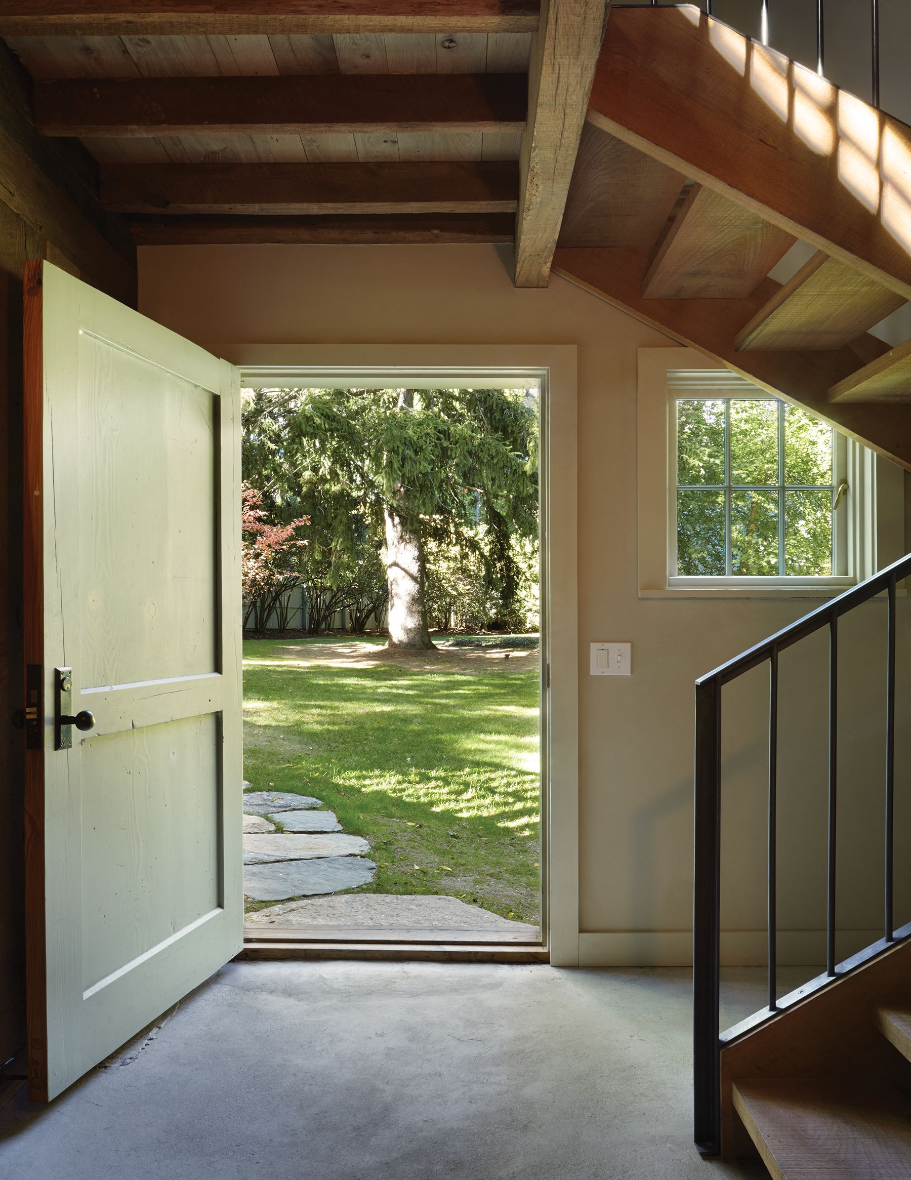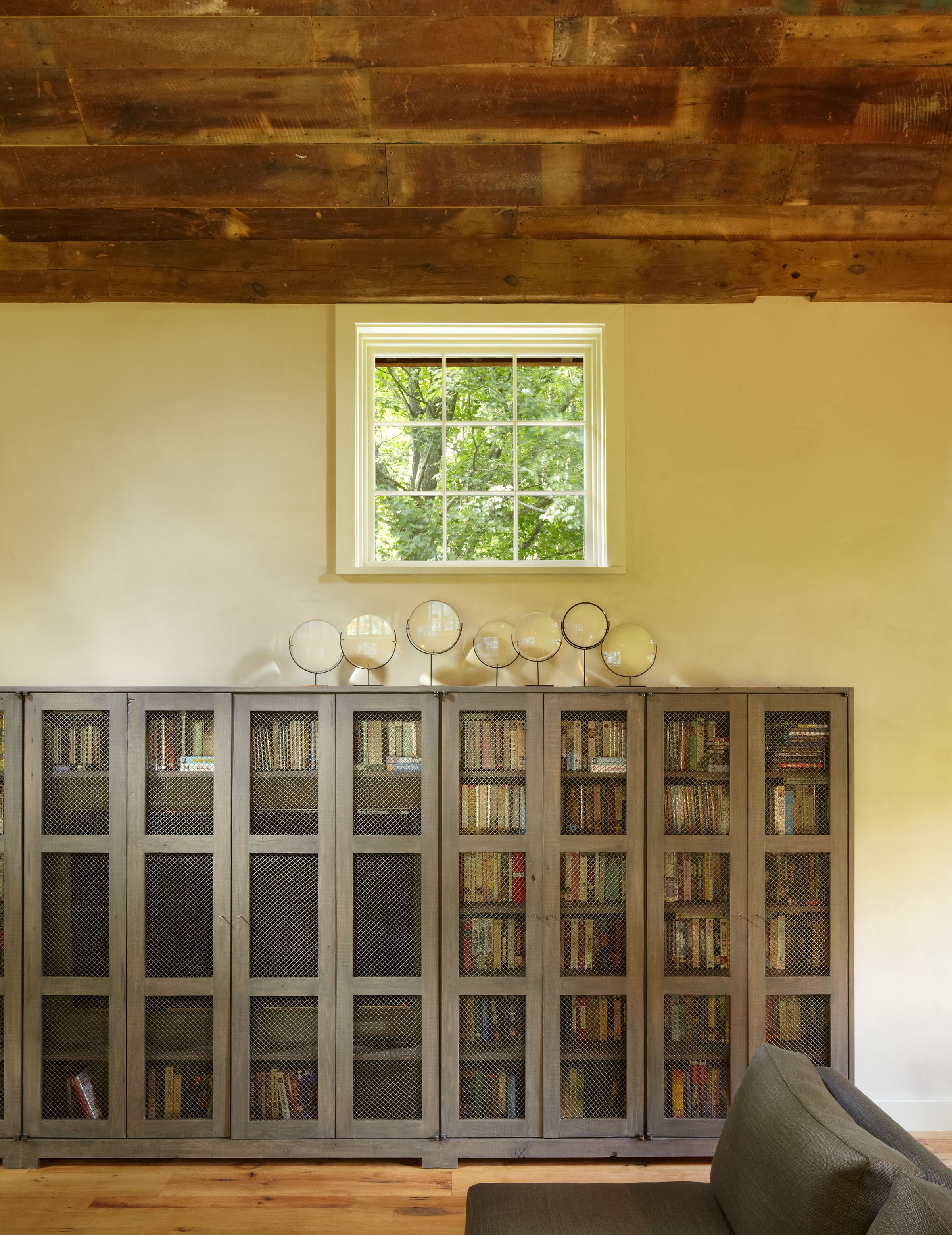 Making new from old, this adaptive reuse project on an estate in the suburban New York village of Bedford converted a historic barn into a rustic-but-refined 800-square-foot guesthouse. The dilapidated barn needed complete reconstruction, and the village required it to be rebuilt in its original form. To meet this challenge, the structure was painstakingly measured, then disassembled and rebuilt to carefully maintain its quirky slopes and mismatched corners. Finished with wood shingles, the barn will weather to its original silver-gray color. The two-story interior fills two functions, the upper level serving as a media room for weekend movie viewing, the lower containing guest entry, bedroom and bath. Inside, the mix of reclaimed materials includes a ceiling clad in wood repurposed from the historic structure.