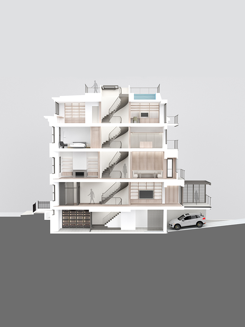 This 4,600 sf residence is currently in construction. This is a gut renovation and reconstruction of a pre-Civil War townhouse in Boston’s historic South End neighborhood. While the street facing façade is being restored with historical accuracy, the interior of the home will be entirely reconstructed with a modern POV, and every modern convenience. The original historic five level staircase will be restored and a new retractable skylight added above which will access a new roof deck and flood the center of the home with natural daylight from top to bottom.