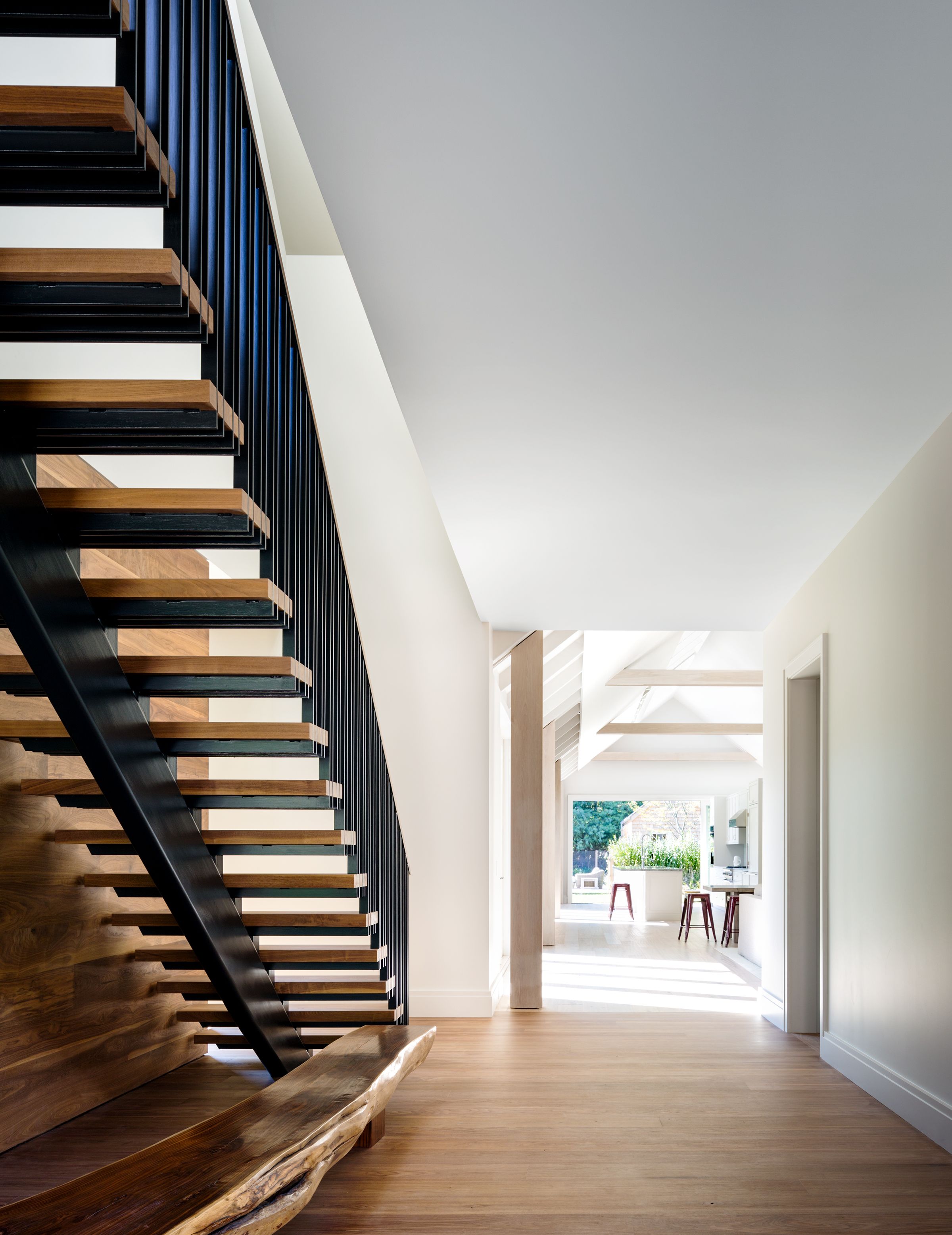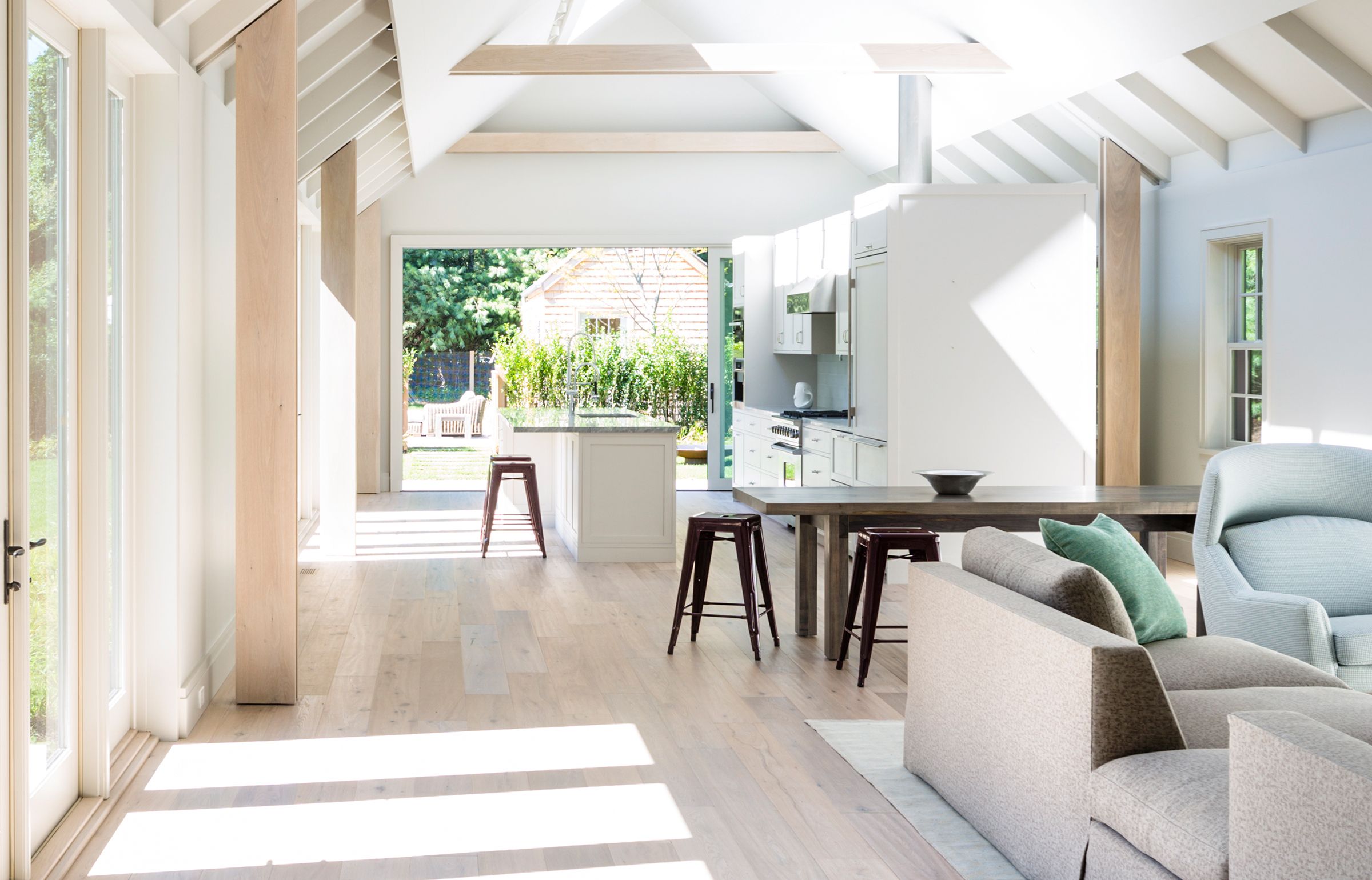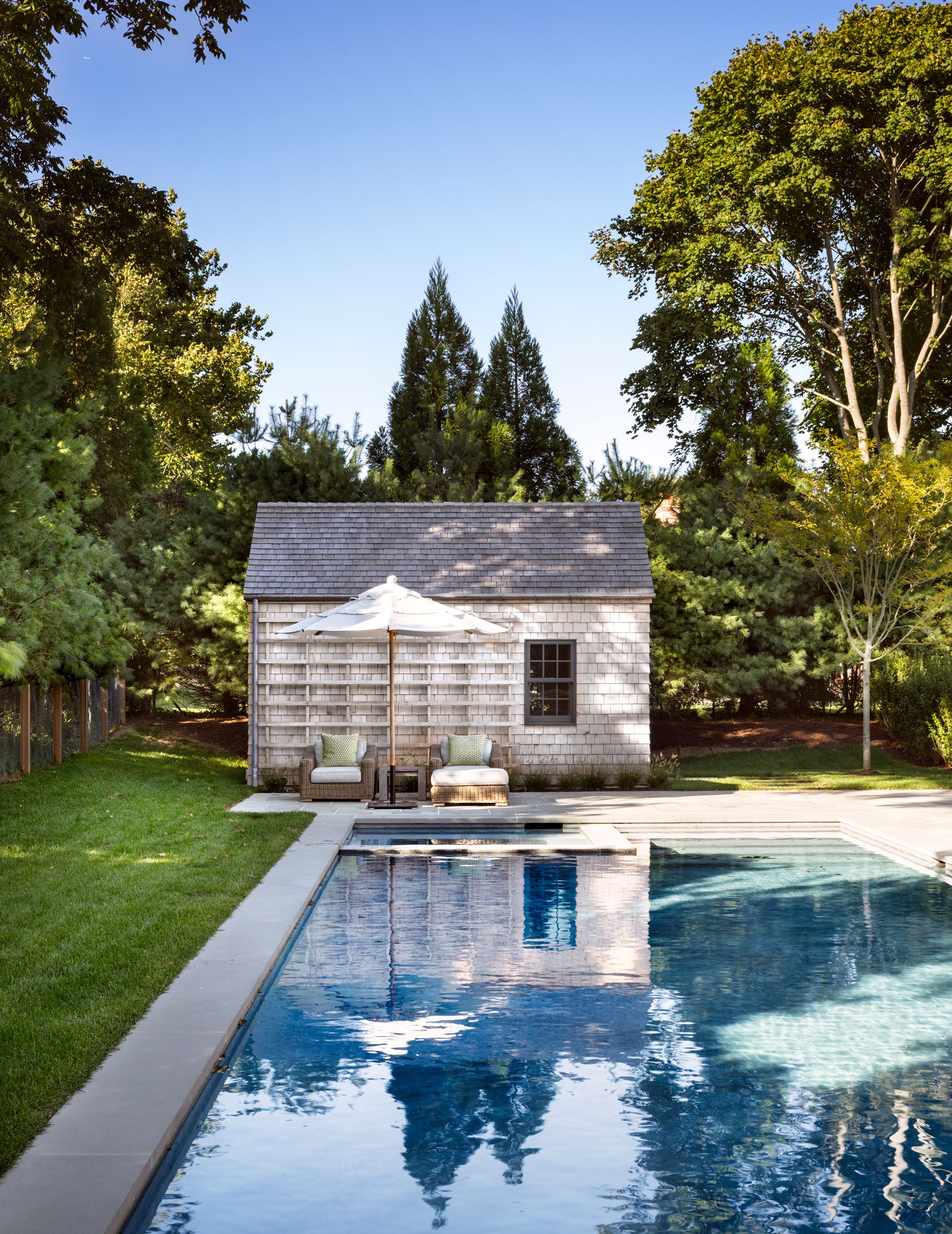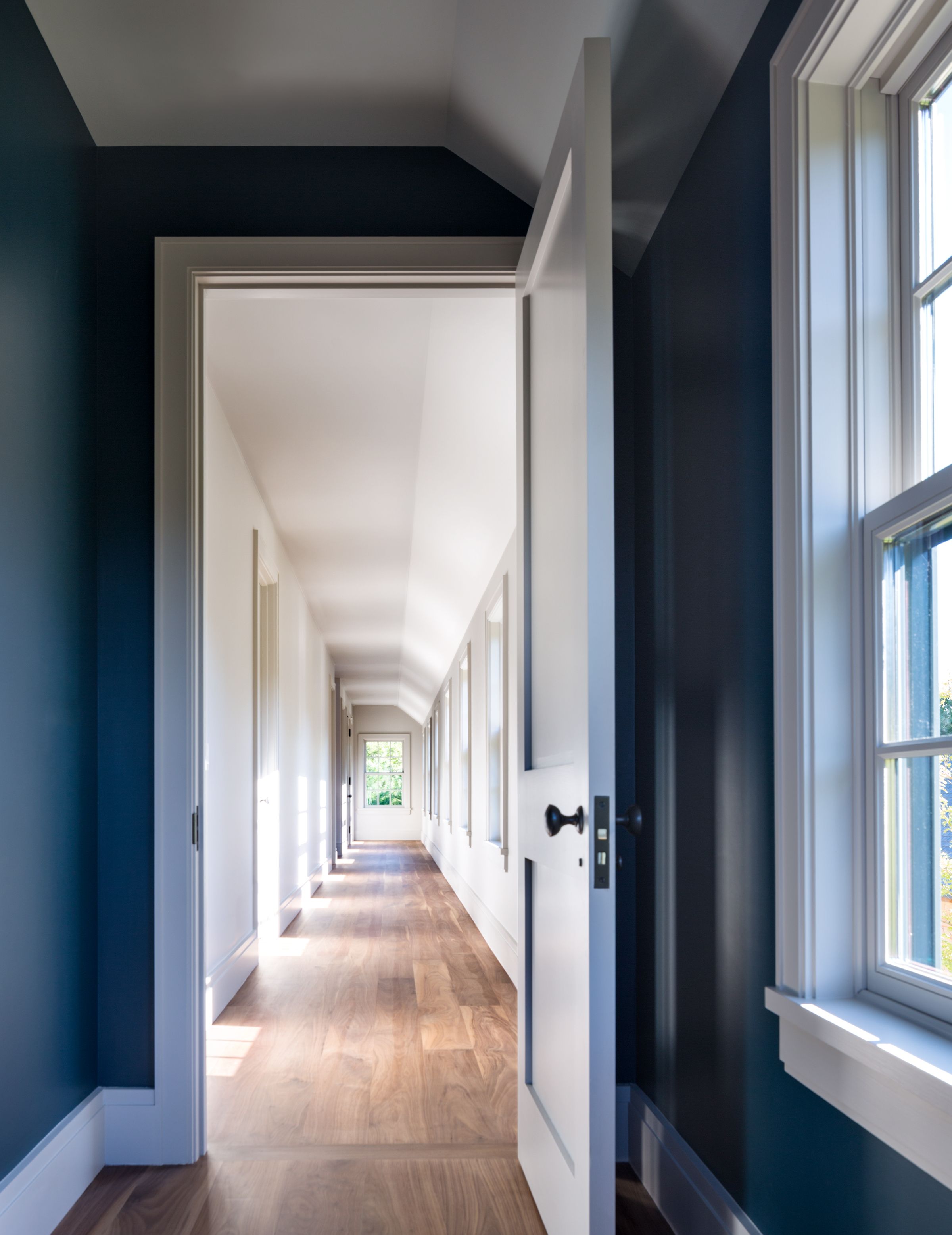 This 9,900-square-foot new-build house combines a traditional façade, inspired by its setting in the quaint village of East Hampton, with contemporary, light-filled interiors designed for 21st-century living. Formal, historic and private, the street-facing elevation evidences the elegant proportions and spare detail of Shaker architecture, while the rear proves more informal, modern and open, its wide sliding-glass doors leading to a sun-filled backyard. Inside, natural materials and large windows visually connect this family country home to the landscape. The ground-floor great room’s exposed wood rafters, open plan and natural light — much of it from a 45-foot-long gabled skylight — continue the relaxed feeling. Upstairs, four bedrooms sit off a single hallway running the length of the house, allowing for easy transfer of light and air.