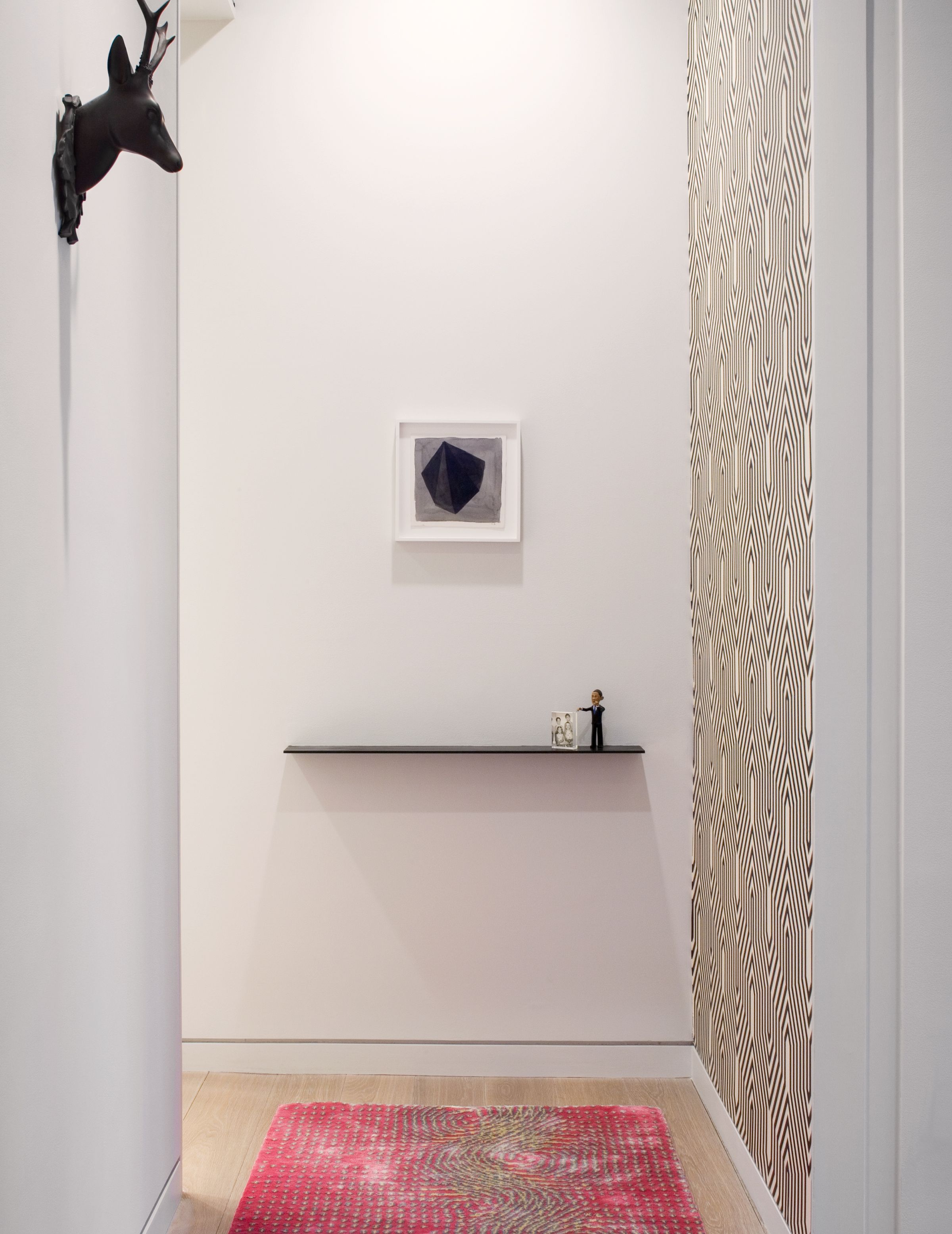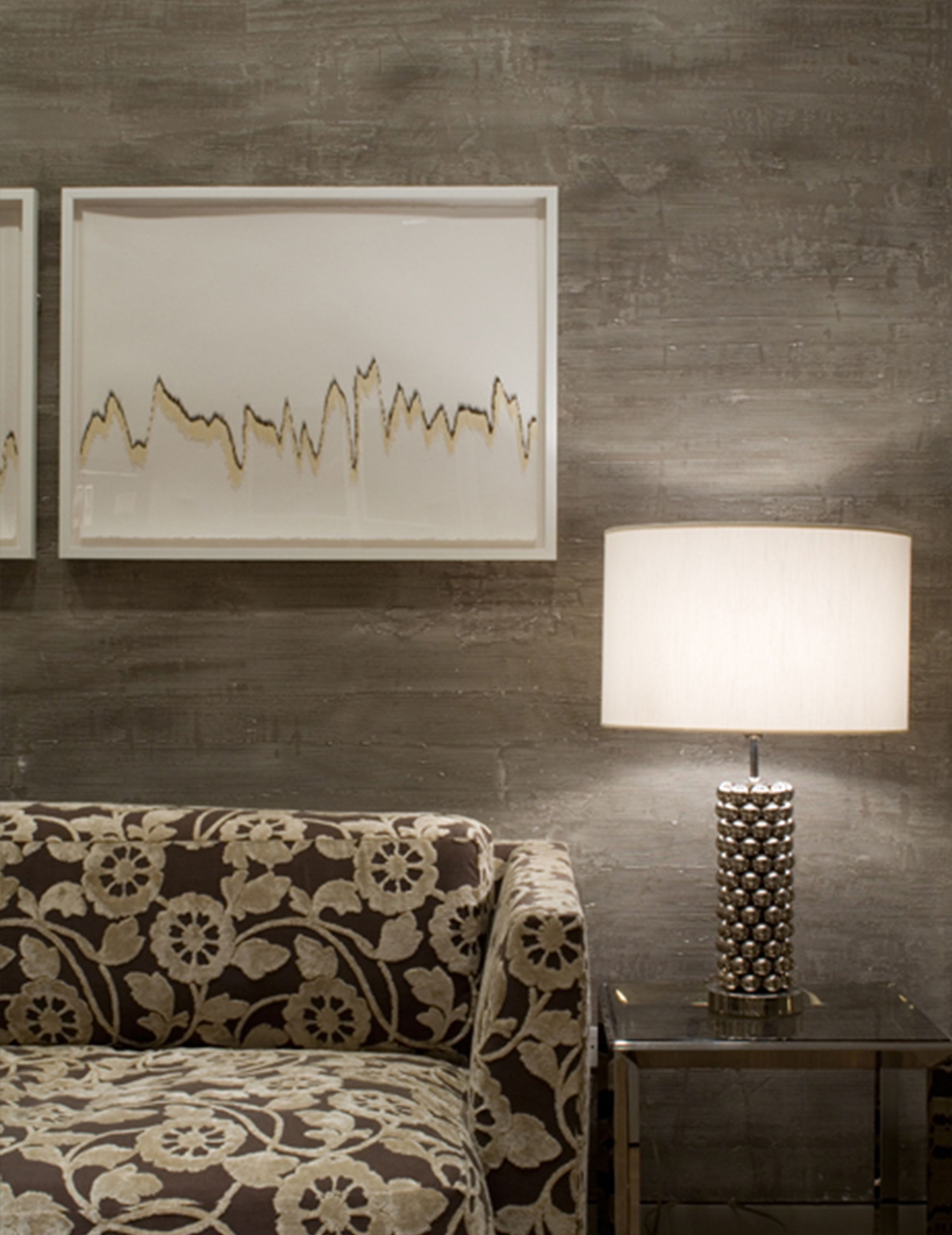 A study in materiality, with texture and pattern explored in virtually every surface, this project in Manhattan’s Greenwich Village transformed a raw commercial space into a 1,750-square-foot loft comprising a master suite, a convertible media-guest room and a great room with an open kitchen designed for entertaining. Clad largely in stainless steel and European walnut, the kitchen centers on a French-marble-topped island whose angled, mirror-polished sides reflect a fumed-oak floor and clear acrylic stools. The eclectic living area features a herringbone-patterned, warmly colored silk rug and custom crushed-velvet sofa and lacquered credenza. In the master, an eel-skin leather headboard sits atop a celadon silk carpet, while the media-guestroom includes a mid-20th-century Italian glass pendant light and raked-plaster walls. Calacatta marble slabs and floating glass walls define the bathrooms.