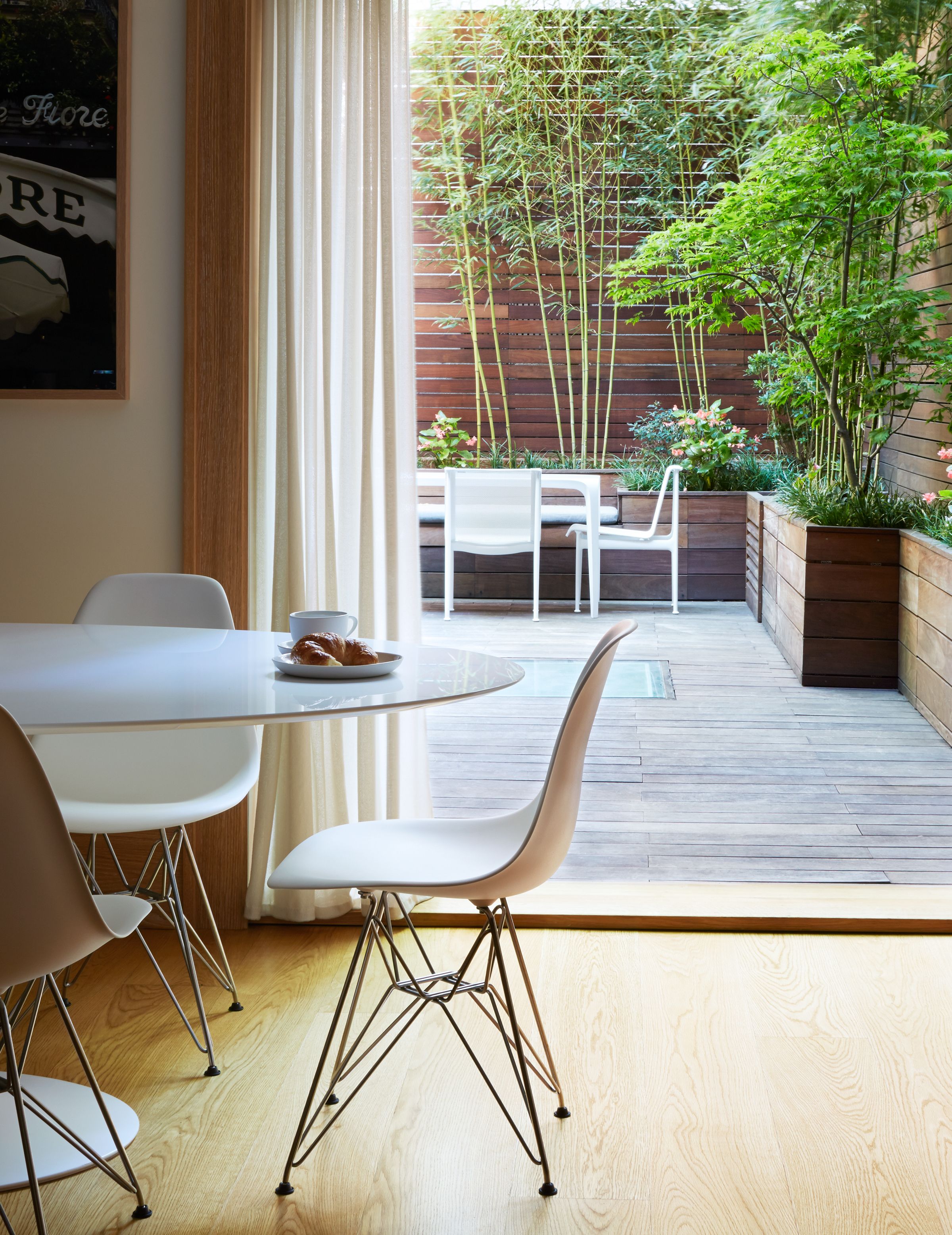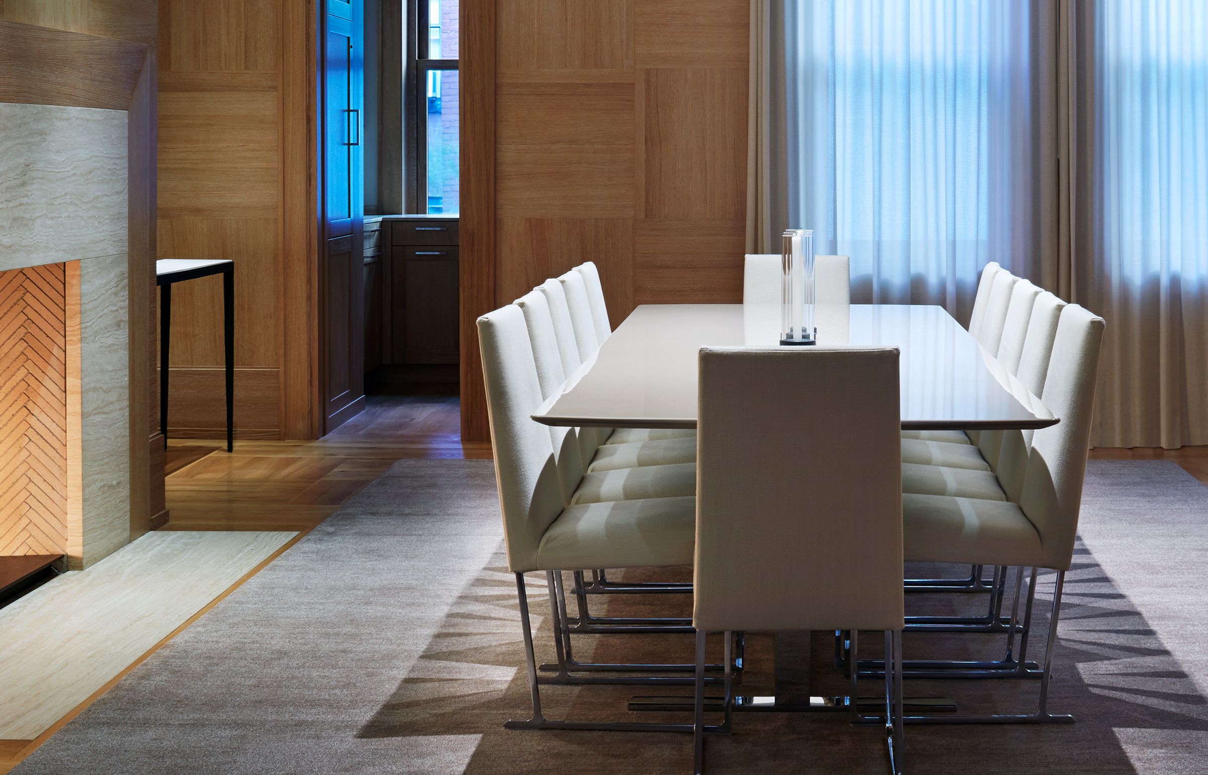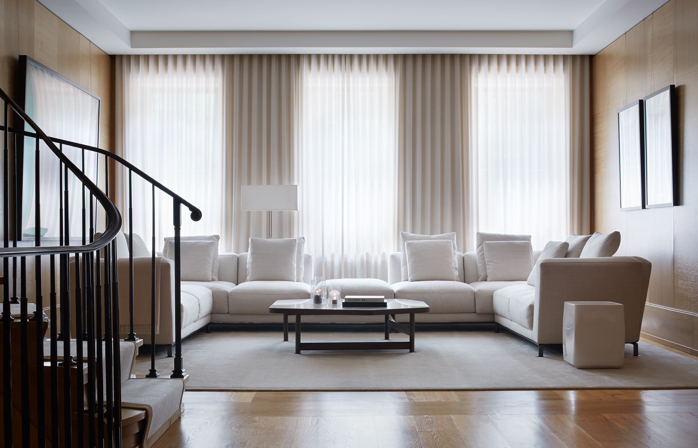 The sweeping scope of this seven-story townhouse project on Manhattan’s Upper East Side comprises six bedrooms; living, dining and kitchen areas; a gym; and a subterranean indoor swimming pool, as well as a backyard and roof terrace. The homeowners purchased the historic building after its renovation and then commissioned custom interiors. Existing Italian-oak paneling set the stage for a selection of modern furniture carefully placed throughout the 9,000-square-foot house. Sheer draperies and muted fabrics bring a sense of calm quietude and serenity to the interiors, as does the spare quality of the overall scheme, which allows the clients’ art collection — including works by Andy Warhol and Thomas Struth — to take center stage.