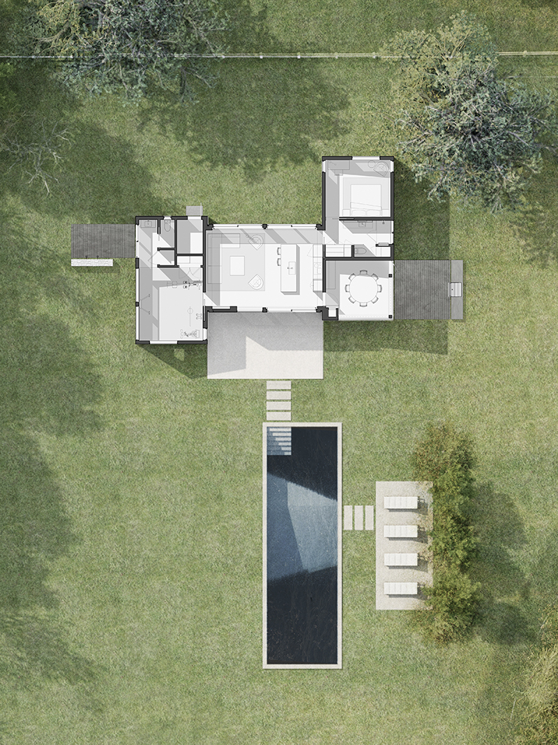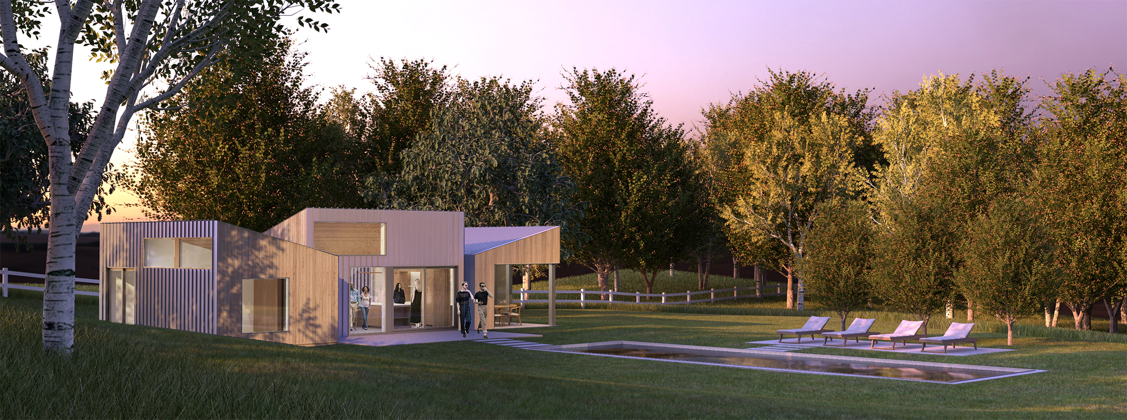 This unrealized 1,000 sf pavilion, conceived as a sculptural object with dramatic pitched roofs and rendered in dark grey cedar and blackened zinc, was designed to complement a new swimming pool. Located in a meadow, some distance from an existing historic home, the structure was designed to contain a small living space with kitchen and dining, a guest suite, a small gym and bath facilities servicing the pool and gym.