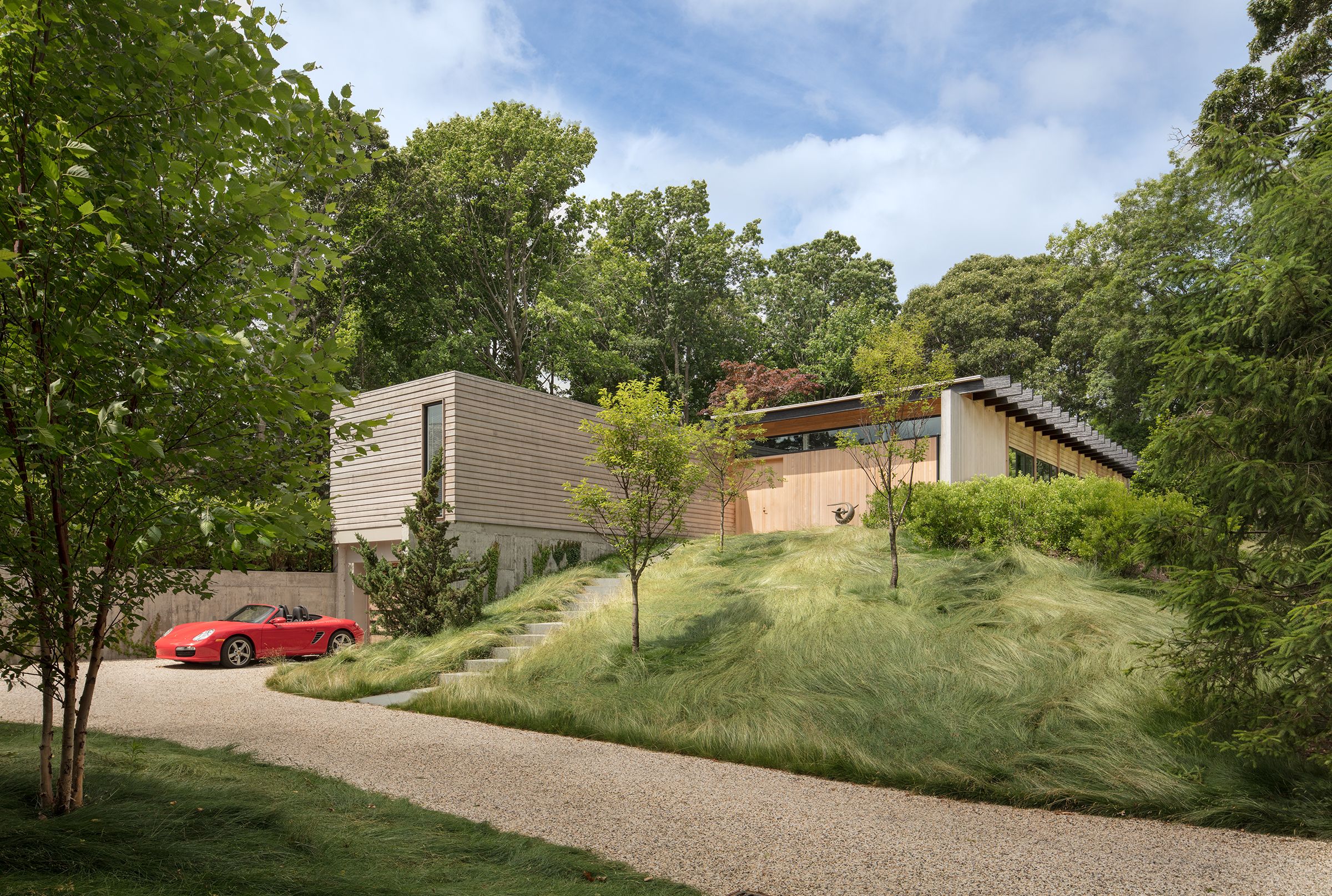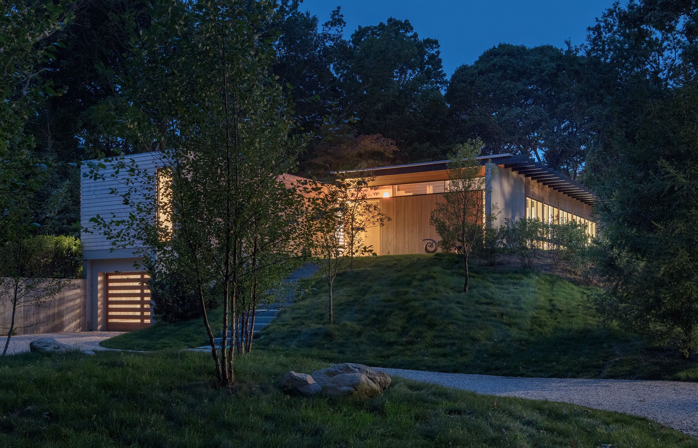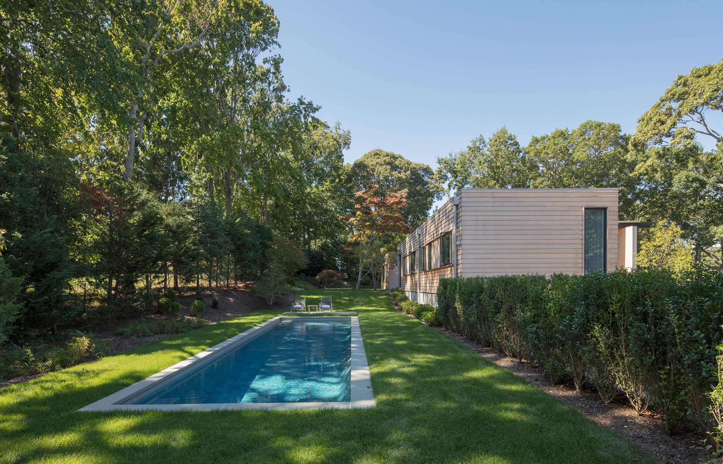 This 3,000 sf private residence sits just outside of the village of Sag Harbor, NY. The house is situated on the highest point of the property to take advantage of the water views. It is comprised of three volumes, the Great Room, featuring kitchen, dining, and living areas, the Master Suite, and the Guest Wing. A lap pool and an adjacent courtyard provide space for outdoor entertaining.