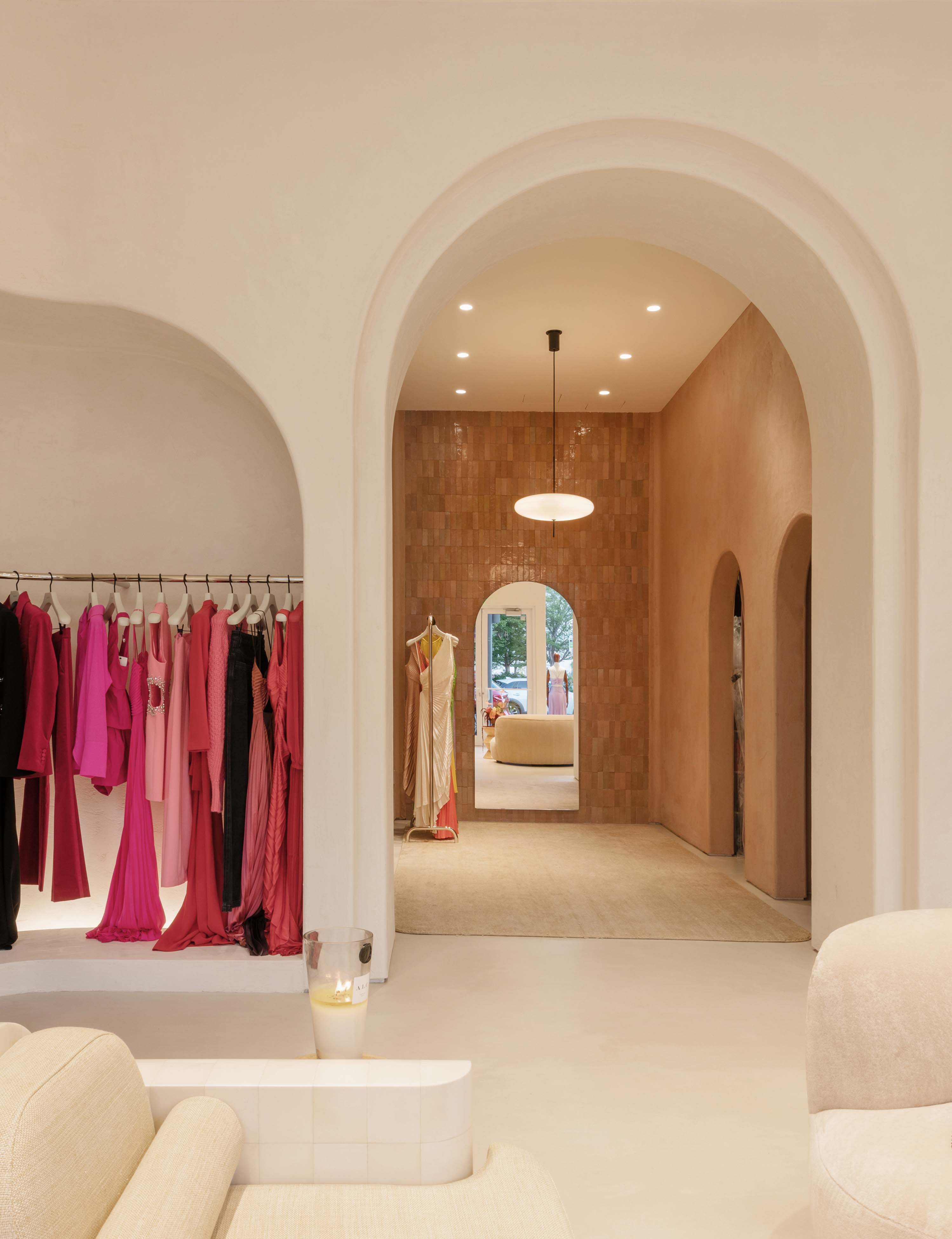 A.L.C. Miami is the latest location designed by janson scuro for fashion brand A.L.C. Located in Miami’s Design District, the store retains the brand’s signature sinuous curves, arches and textured plaster walls while adding hand-crafted Moroccan tile and velvet drapery in soft rose tones. Over-scaled armchairs in lacquered vellum and a white boucle curved sofa add to the luxurious residential feel.
