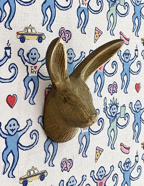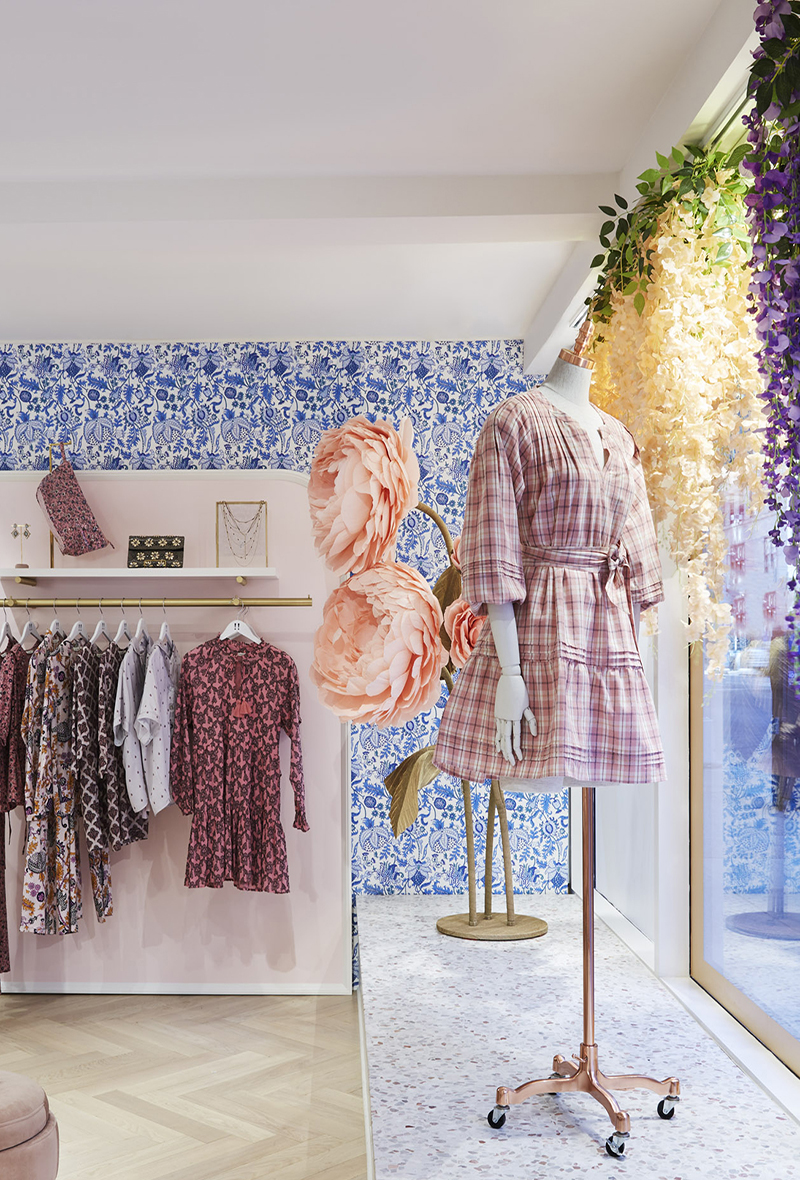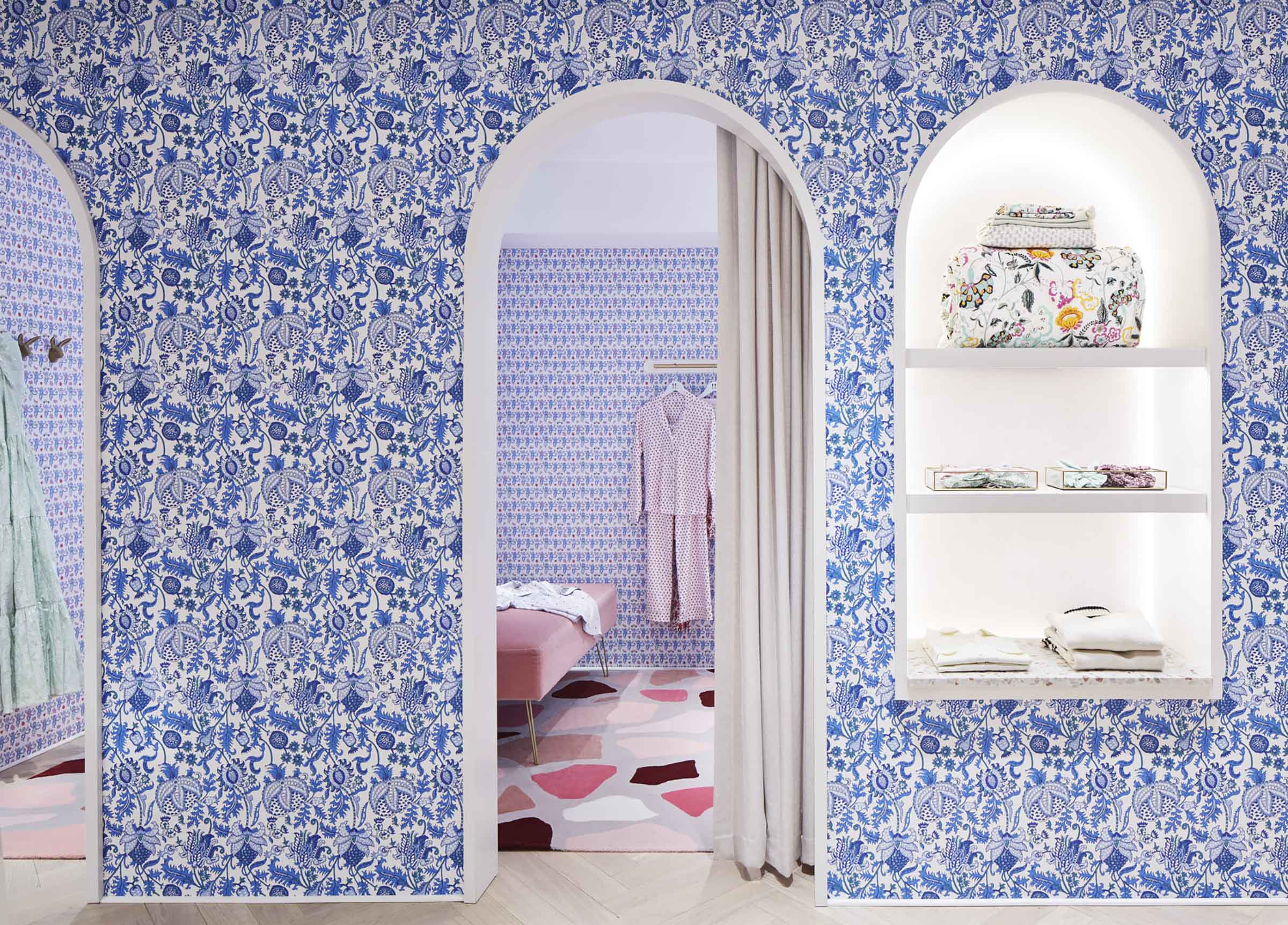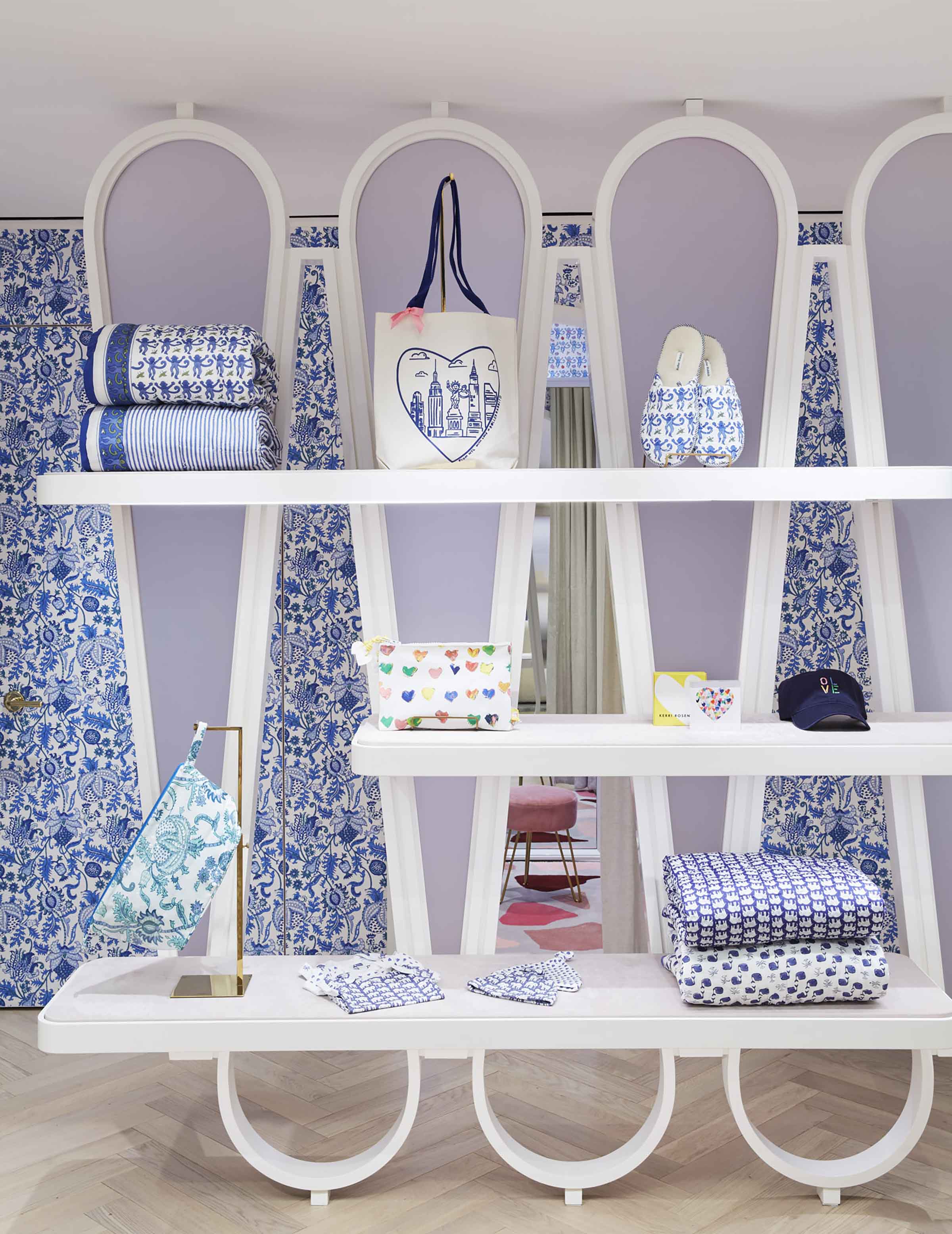 Roller Rabbit approached janson scuro to develop an environment that would showcase their bold and colorful patterns and prints, and celebrate the spirit of ease and play that is the DNA of the brand. janson scuro employed Roller Rabbit’s unique prints not only as inspiration, but as the signature finish element for the store. Wallpaper made from their iconic Amanda print covers the walls within the shop, enveloping the space in a soft green/blue color and pattern. White lacquered shelving niches backed with pink ultrasuede wall covering and a series of stain brass hangbars complete the vignette.