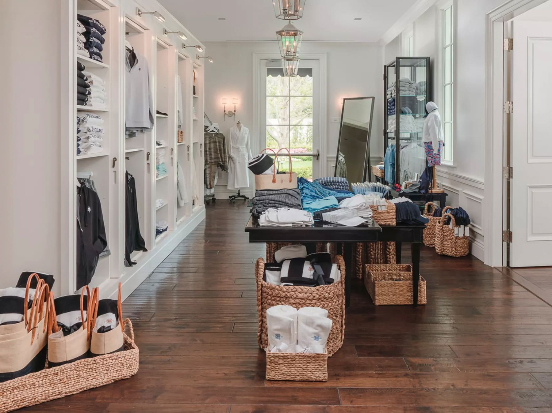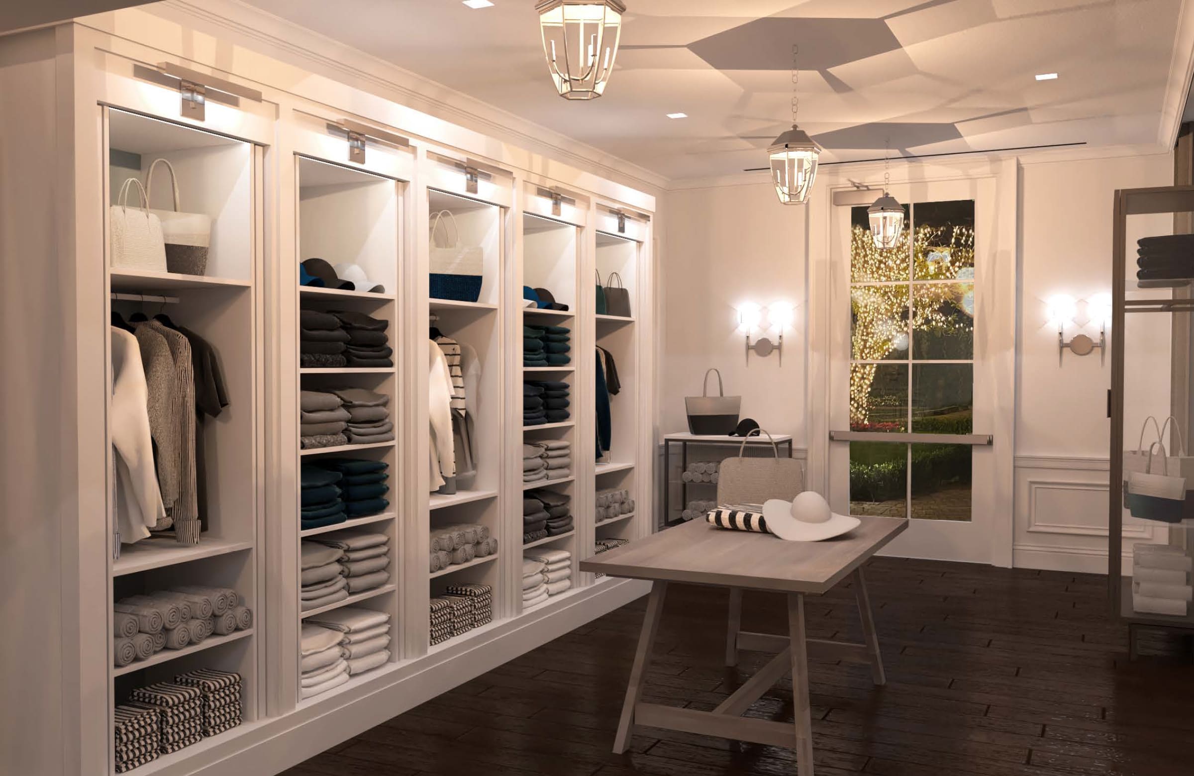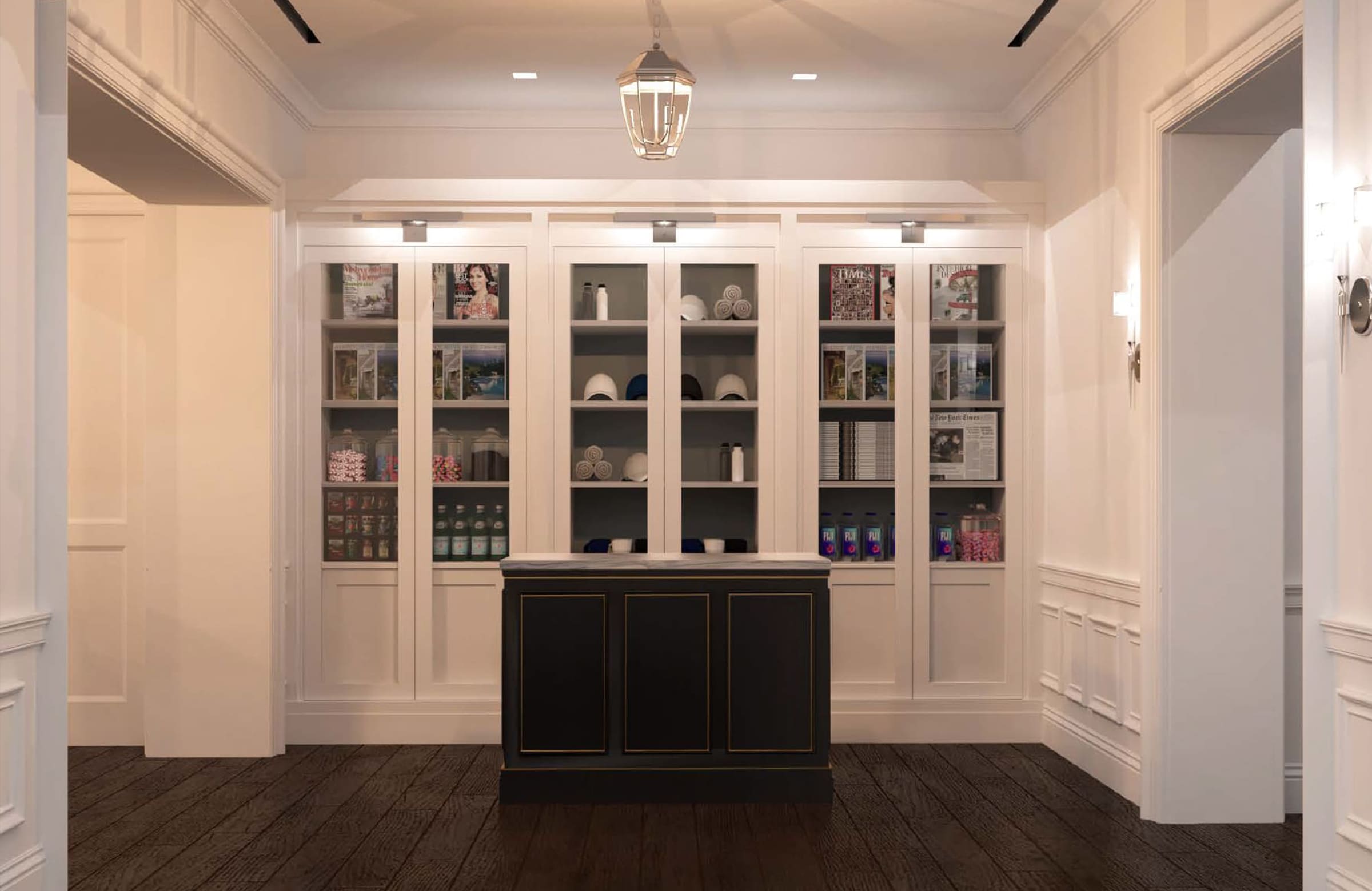 janson scuro created this retail boutique for Miramar branded merchandise and sundries, located adjacent to the lobby of the new Rosewood Miramar Beach resort. The project is conceived to respond to and complement the existing atmosphere of the resort, and to maximize product display and accessibility within a tightly constrained space. Additionally, because the space is accessible 24/7, the product displays were conceived to be enclosed during off-hours. To accomplish this, glass doors which provide security as well as visibility slide away and are fully concealed during business hours.
